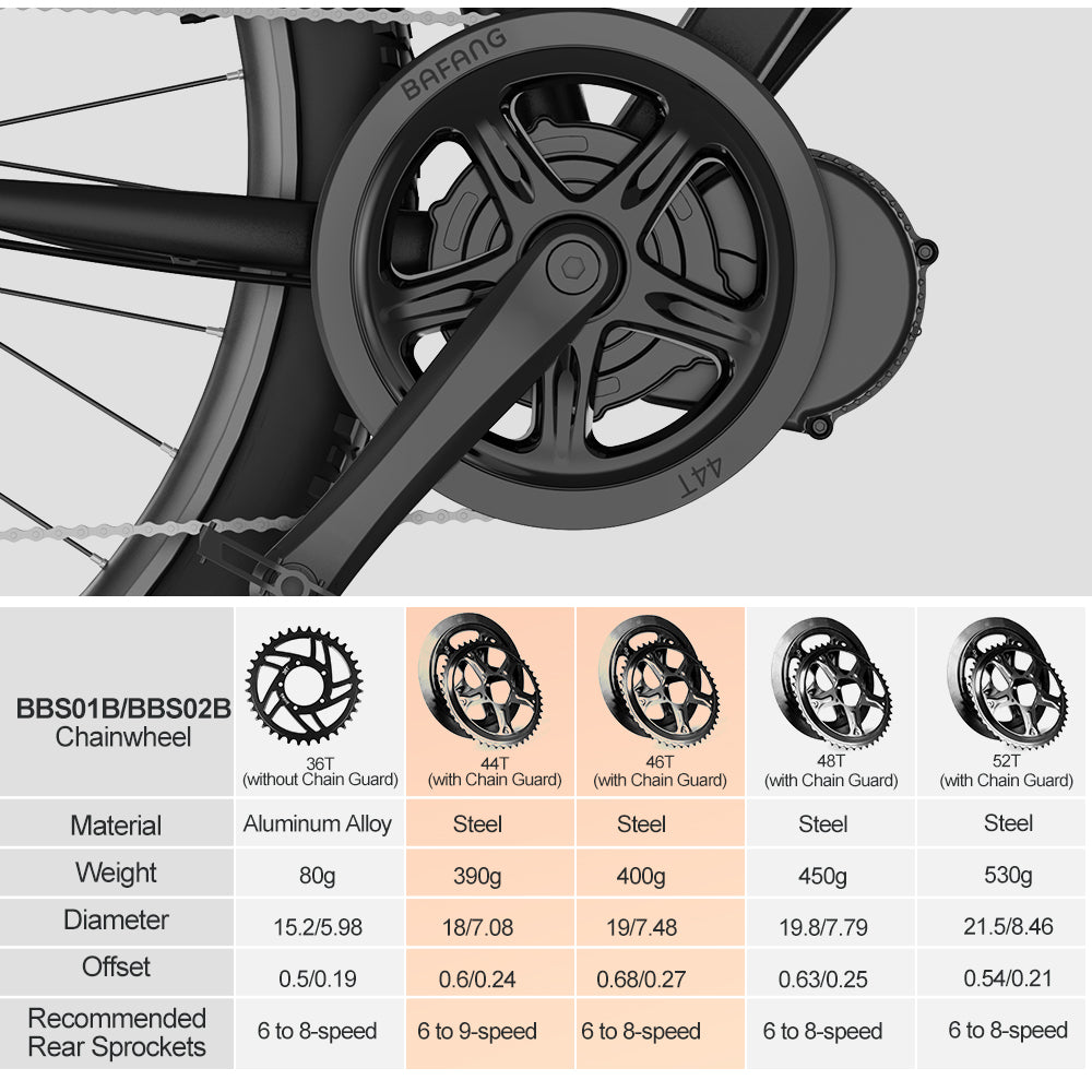 Varstrom offers 36/44/46/48/52T chainrings for BAFANG BBS mid-drive kits.