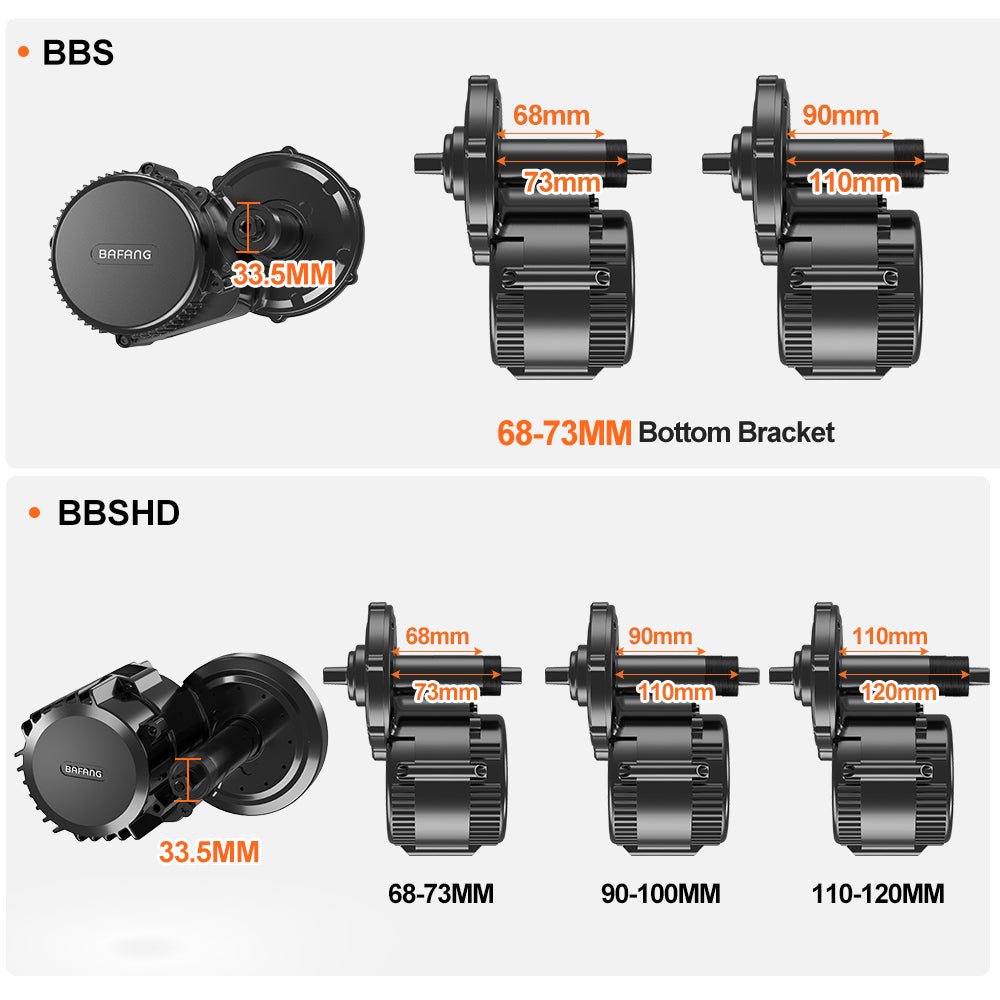 BAFANG BBS motors have a bottom bracket shaft diameter of 33.5mm and are designed to fit into the bicycle bottom bracket standard known as JIS or Japanese Industrial Standard. JIS is one of the international bicycle standards which is very similar to standard in the US commonly referred to as "square tapered spindle", ISO/English, BSA, British, or "threaded". Available in 4 widths, 68/73/100/120mm. If the bottom bracket inside diameter of your bike is 33.6mm to 36.0mm. All you need to do is order a motor in the correct width.