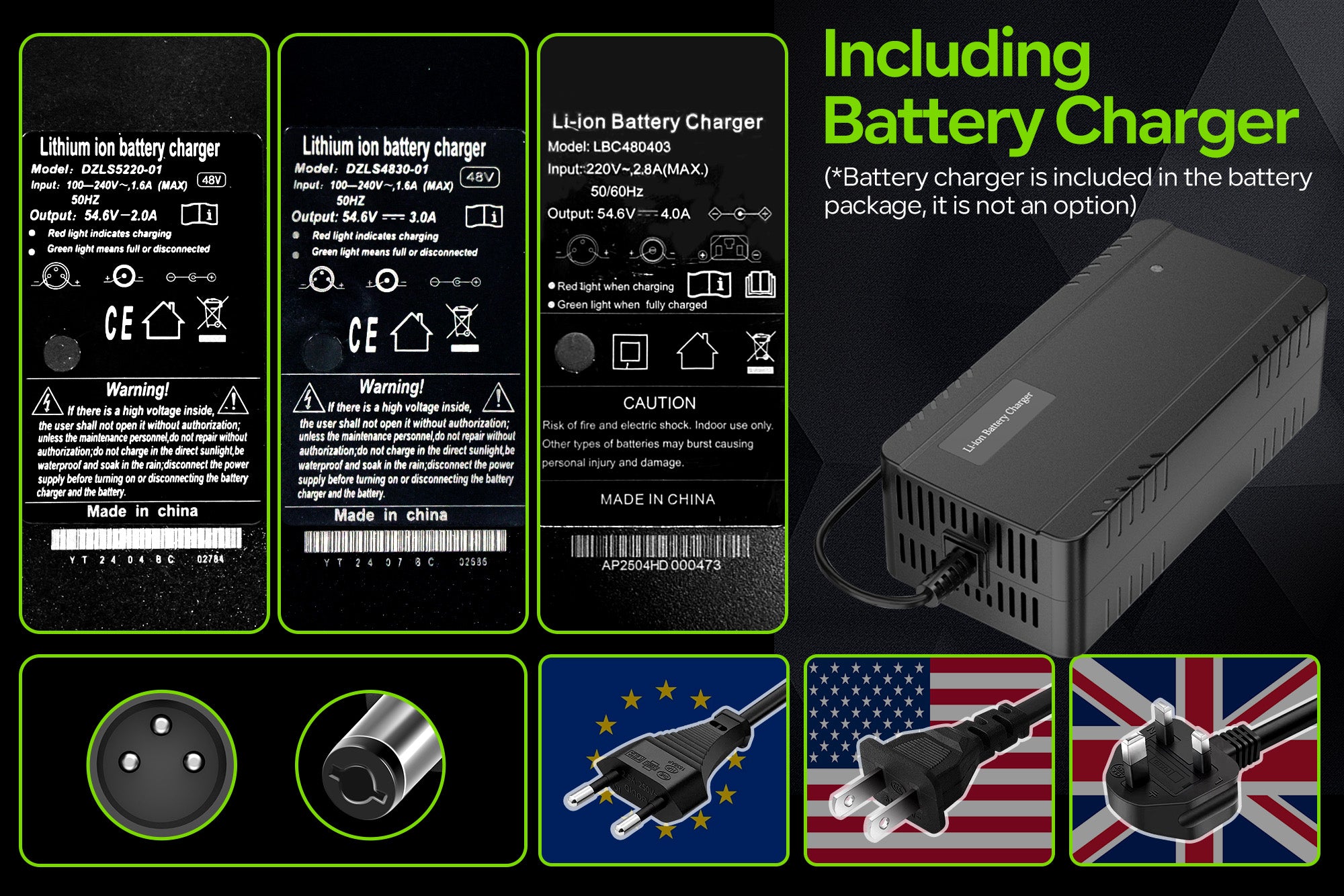 • 52V Batteries: 58.8V 3A(DC 2.1), 58.8V 4A (XLR)