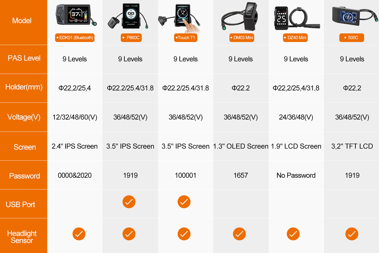 Varstrom eBIke Displays: Touch T1, P860C, EDK001, B750C, P850C, 850C, 500C, 500C-V, DM03, 800S.
