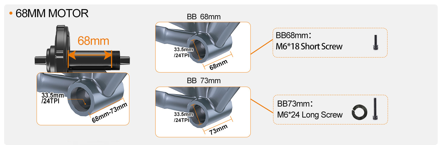 BAFANG BBS motors have a bottom bracket shaft diameter of 33.5mm and are designed to fit into the bicycle bottom bracket standard known as JIS or Japanese Industrial Standard. JIS is one of the international bicycle standards which is very similar to standard in the US commonly referred to as "square tapered spindle", ISO/English, BSA, British, or "threaded". Available in 4 widths, 68/73/100/120mm. If the bottom bracket inside diameter of your bike is 33.6mm to 36.0mm. All you need to do is order a motor in the correct width.