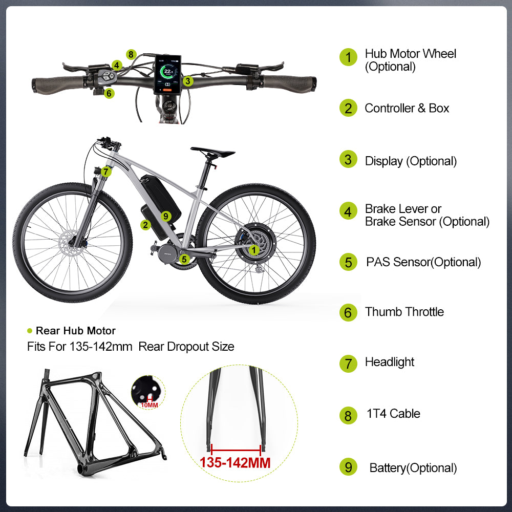 Your Varstrom conversion kit comes with everything you need to get started, including a Rear Hub Motor, Controller & Box, Display (optional), Brake Lever/Sensors, PAS Sensor, Thumb Throttle, Headlight, 1T4 Cable, and compatibility with all Varstrom displays and 48V batteries. No need to shop around for additional parts.