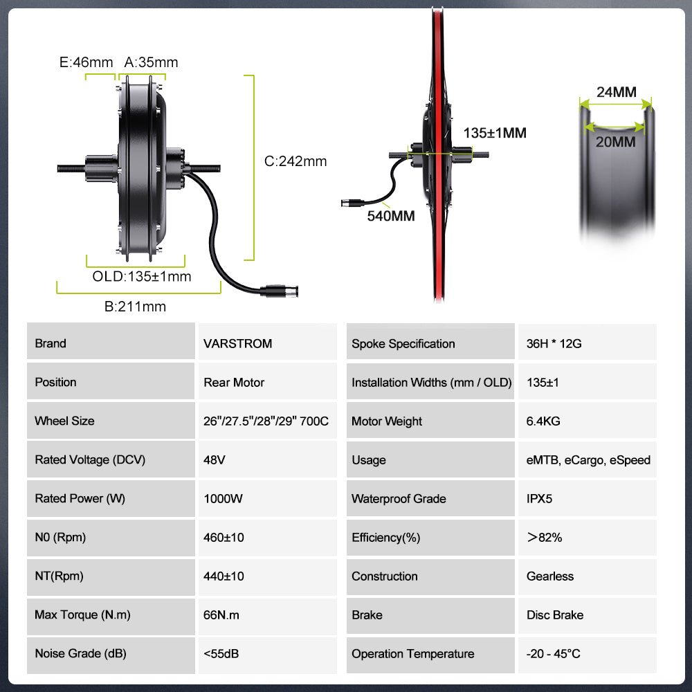 1*Varstrom 48V 1000W Rear Hub Motor with Rim & Spokes